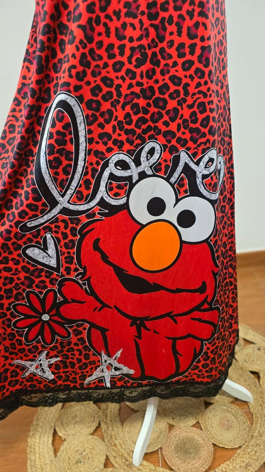 • Vestido lencero con estampado de leopardo rojo y muñeco Elmo.
