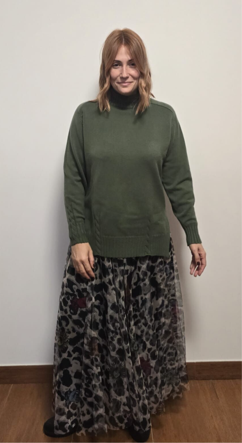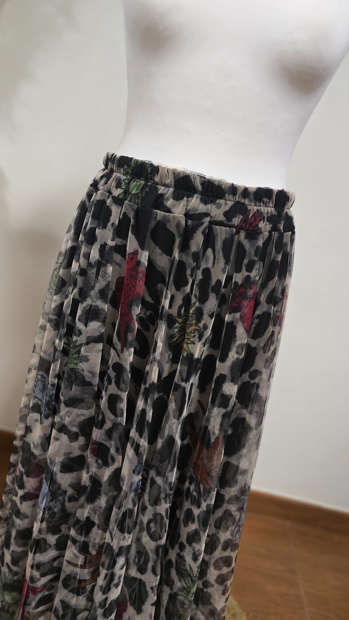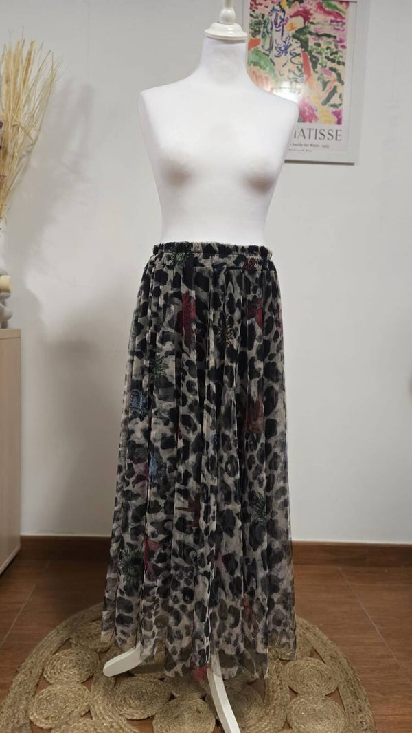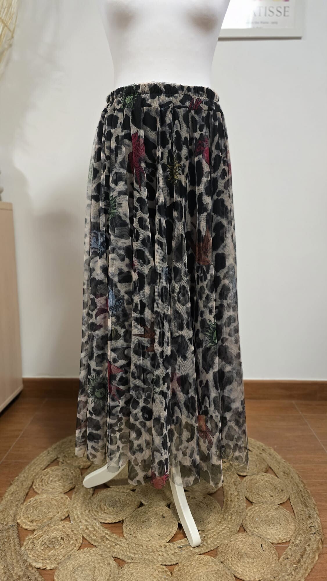 • Falda de tu con estampado de leopardo gris y dibujos en colores.