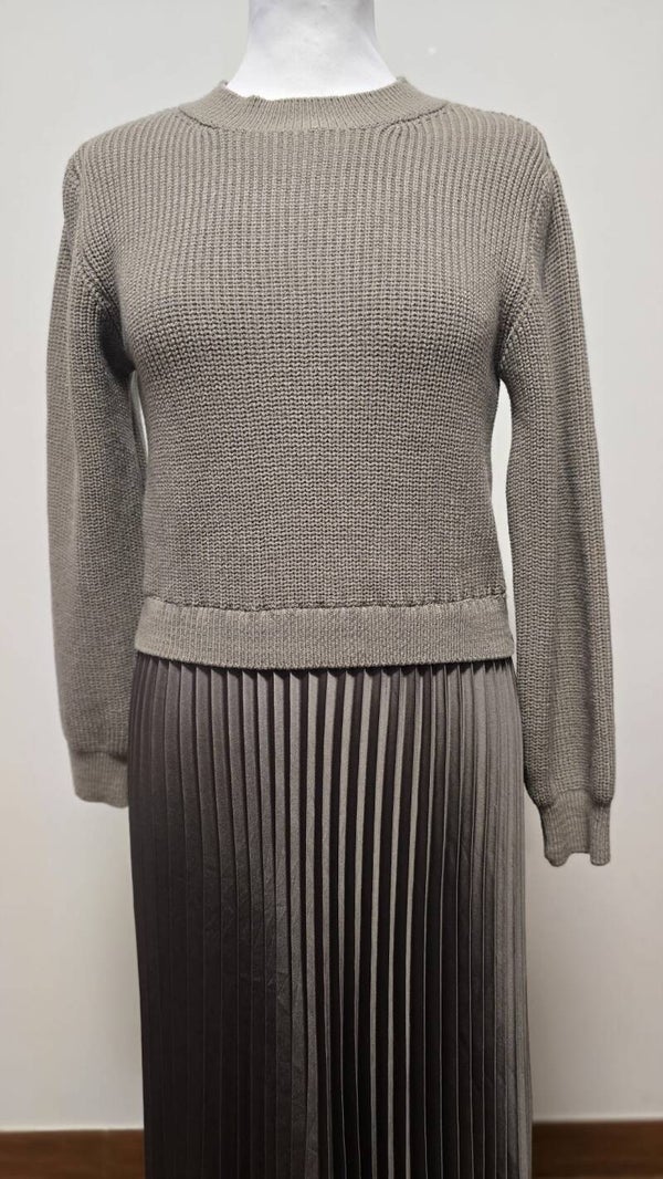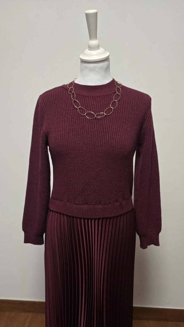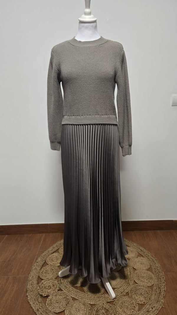 • Original vestido con falda plisada en satén y parte de arriba en lana, colores lisos.