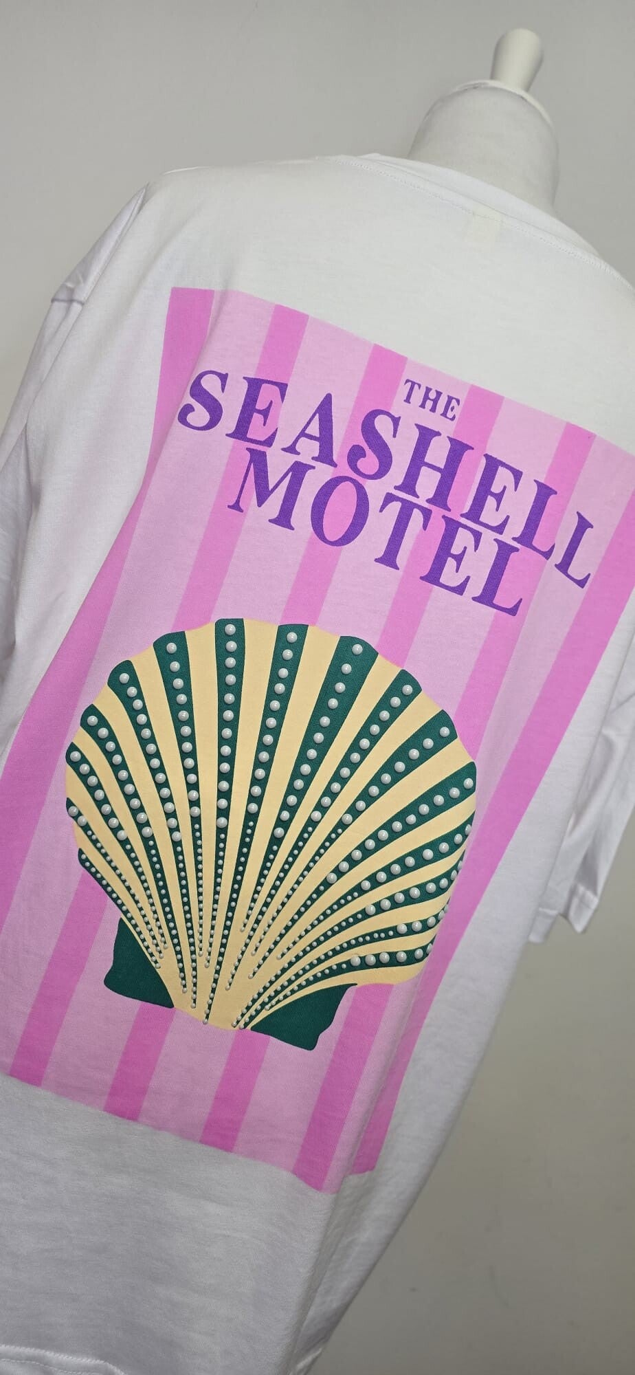 • Camiseta blanca con original y colorido estampado en la espalda , tonos rosas, lilas, verdes y amarillo con perlas.