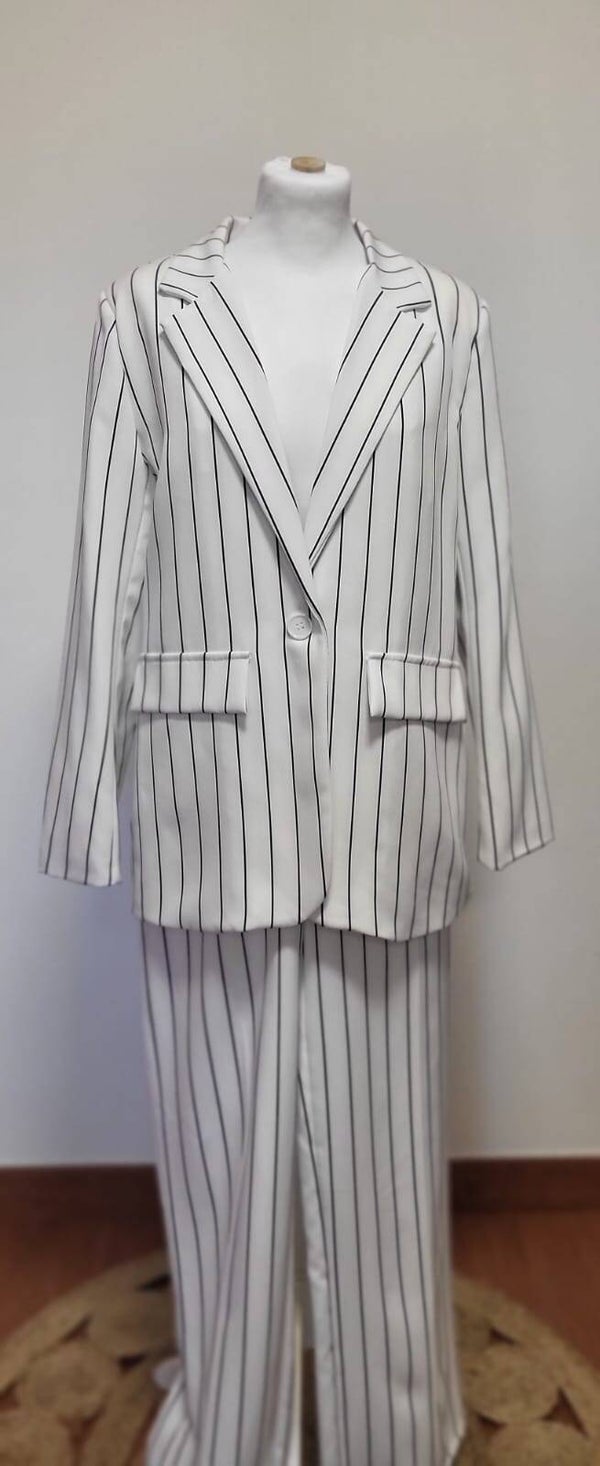 Traje de chaqueta blanco con finas rayas verticales negras que estilizan la figura.